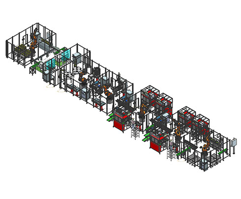 The cylindrical battery module PACK automatic assembly line is composed of loading and sorting machine, inserting bracket machine, battery polarity detection, loading bracket machine, nickel sheet loader, nickel sheet welding machine, welding spot detection, adhesive paper machine, protection plate loading and welding machine, semi-finished product detection machine, shell loader, EOL testing machine, labeling machine and flexible manual position.